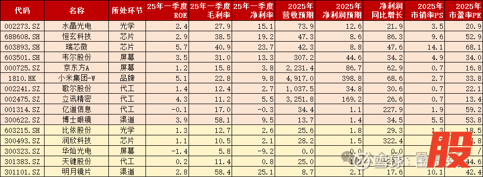 品牌厂商里比较值得重视的是苹果和小米等传统手机厂商,原因是会有品牌效应,同时代工产业链较为清晰,如果能获得大批量订单就有业绩弹性。