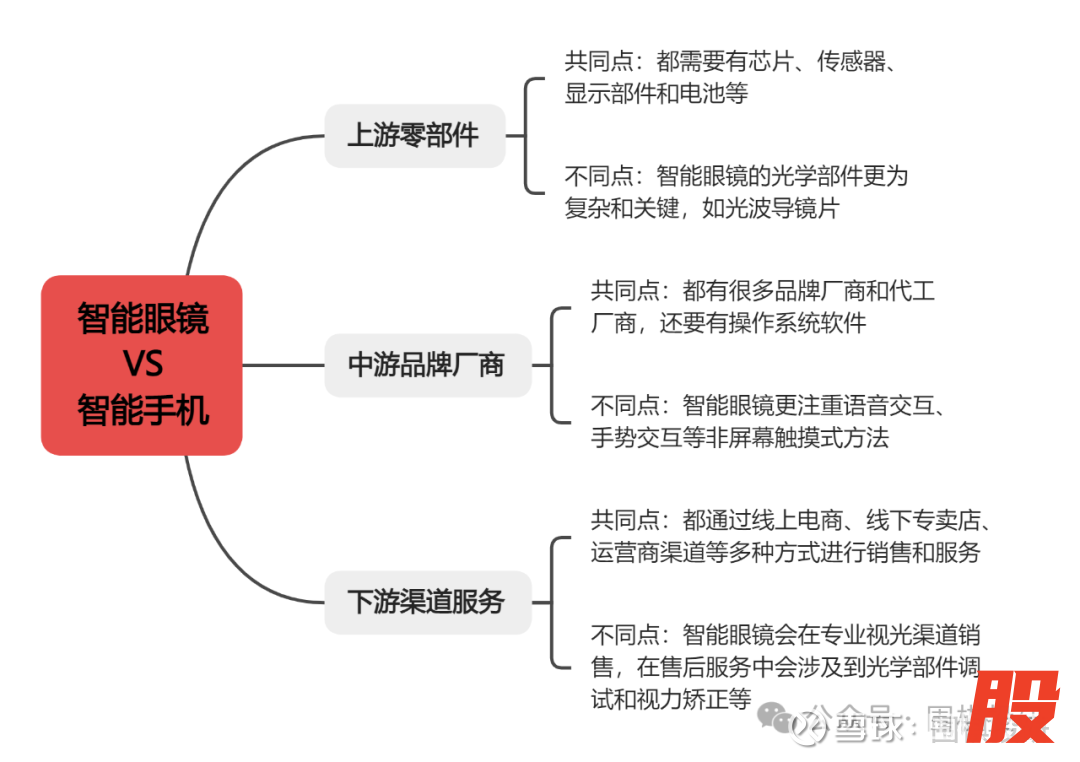 智能眼镜本身不难理解,本质是消费电子,因此基本上能和智能手机做个类比,零部件、品牌厂商和渠道服务都是互通有无,只有些细微差别。