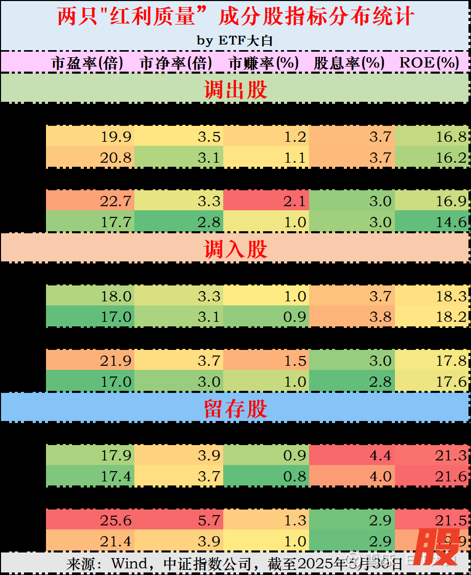 老指数: 更专注“质量”本身:调入股:质量(ROE)也有提升。估值:调入股市盈率降了,但市净率反而升了,股息率基本没变(平均<3%)。对“便宜”不care。