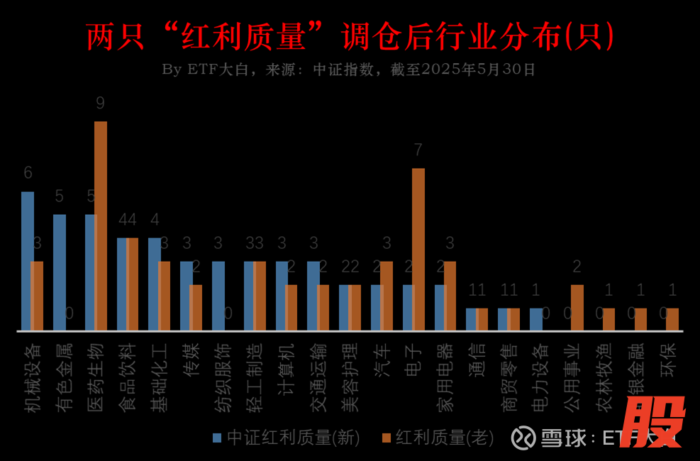 老指数 (红利质量): 没有行业权重限制。 结果就是行业容易扎堆(比如这次调仓后消费、电子占了四成),波动可能会更大。