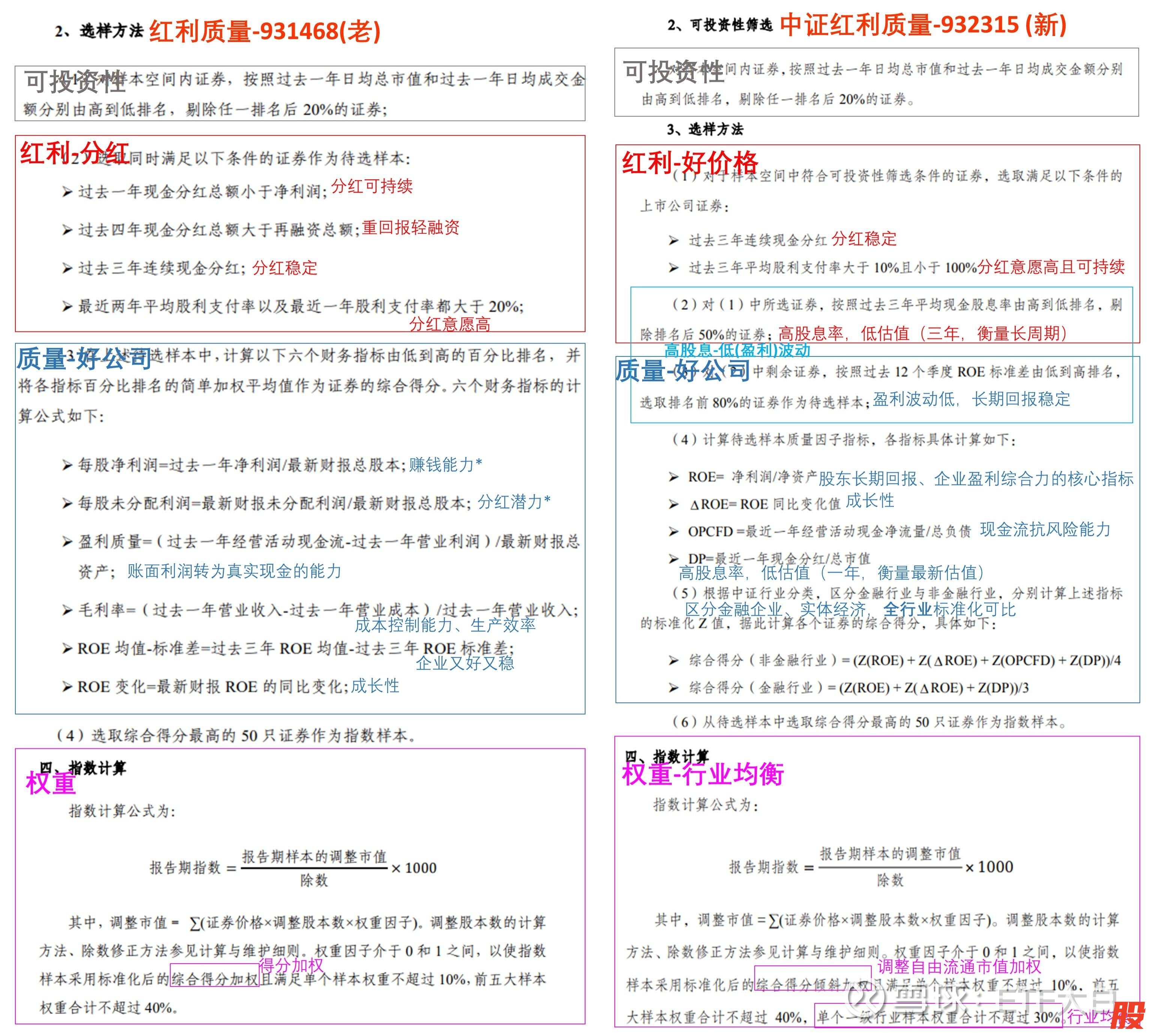 如图,两个红利质量编制方案的逐条解读都标记在图中了。